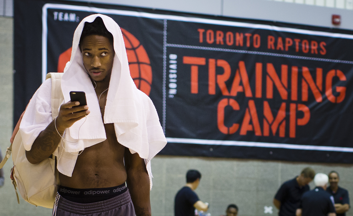 Portrait – DeMar DeRozan of the NBA Toronto Raptors checks his phone following a practice during the teams five day training camp at Fortius Sport and Health on October 1, 2015 in Burnaby, B.C. Canada. ©TorontoRaptors/KevinLight