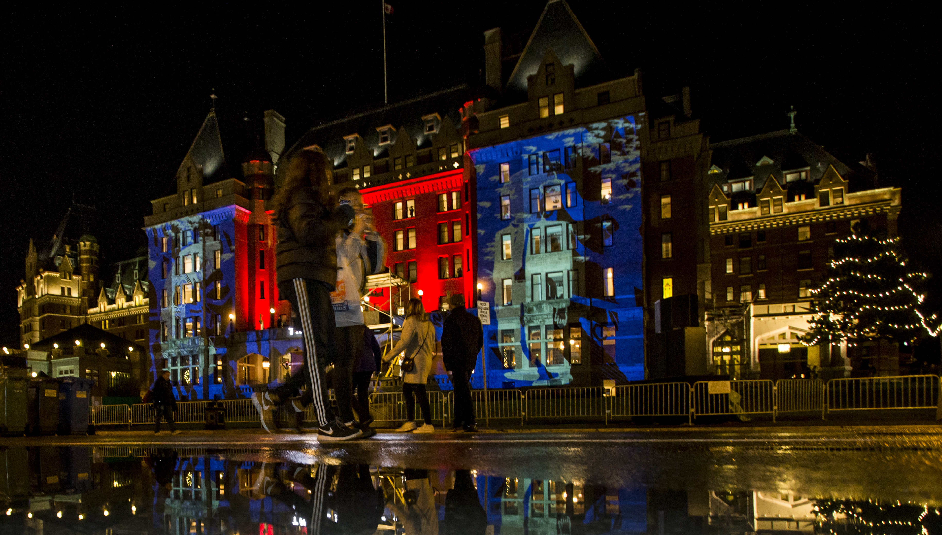 VICTORIA, B.C.: DECEMBER 31, 2016- The Empress Hotel is decorated with red and blue projection lights during the First Night Celebrations in the Inner Harbour in Victoria, British Columbia on December 31, 2016. A spectacle in lights and shadow was played in the front of the Empress Hotel. Images of swaying trees, maple leaves and schools of fish made their way across the front of the hotel. (KEVIN LIGHT).