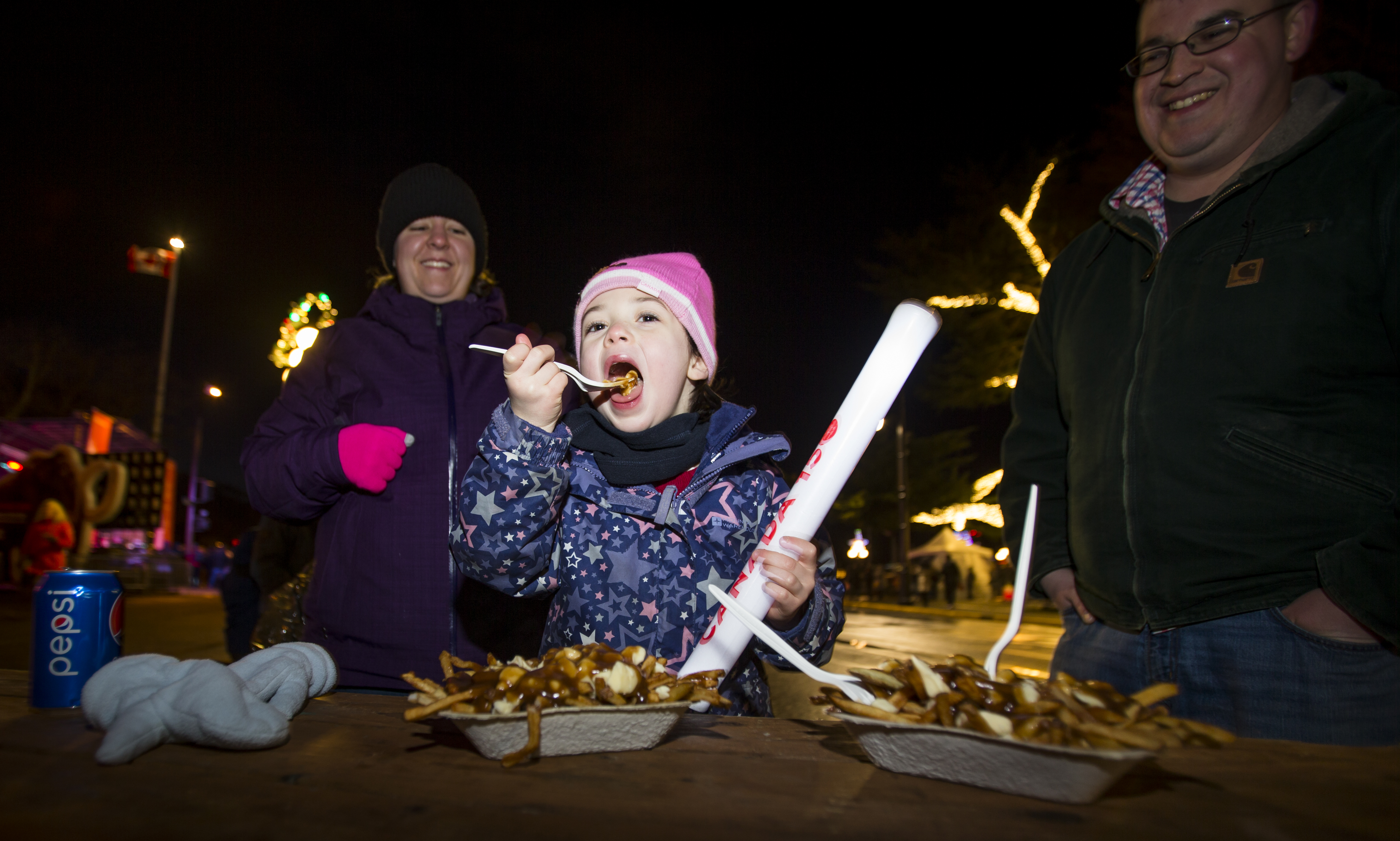VICTORIA, B.C.: DECEMBER 31, 2016- Baea Mayer enjoys a mouthful of her Mother Emily’s poutine as her father Brandon smiles during the First Night Celebrations in the Inner Harbour in Victoria, British Columbia on December 31, 2016. (KEVIN LIGHT).
