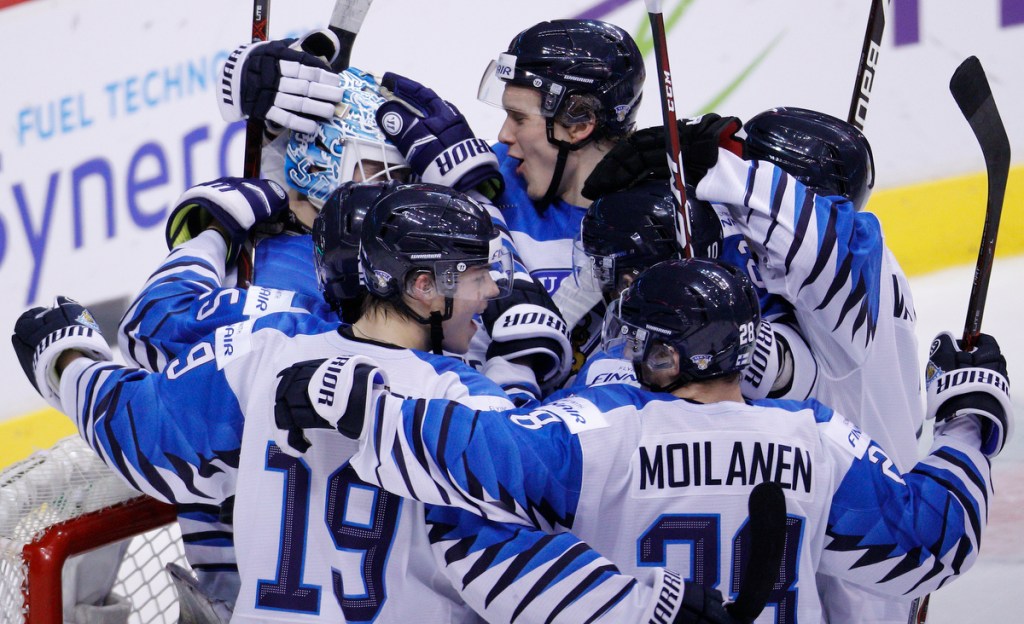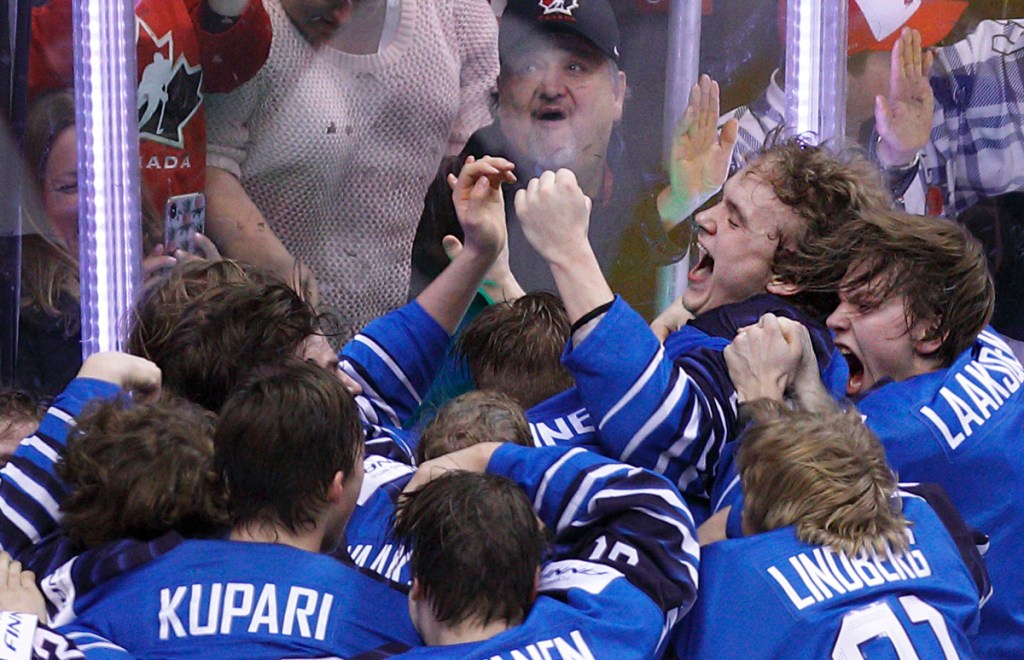 VANCOUVER , BC – JANUARY 5: Finland celebrates a victory against the United States following a gold medal game at the IIHF World Junior Championships at Rogers Arena on January 5, 2019 in Vancouver, British Columbia, Canada. © 2019 KEVIN LIGHT