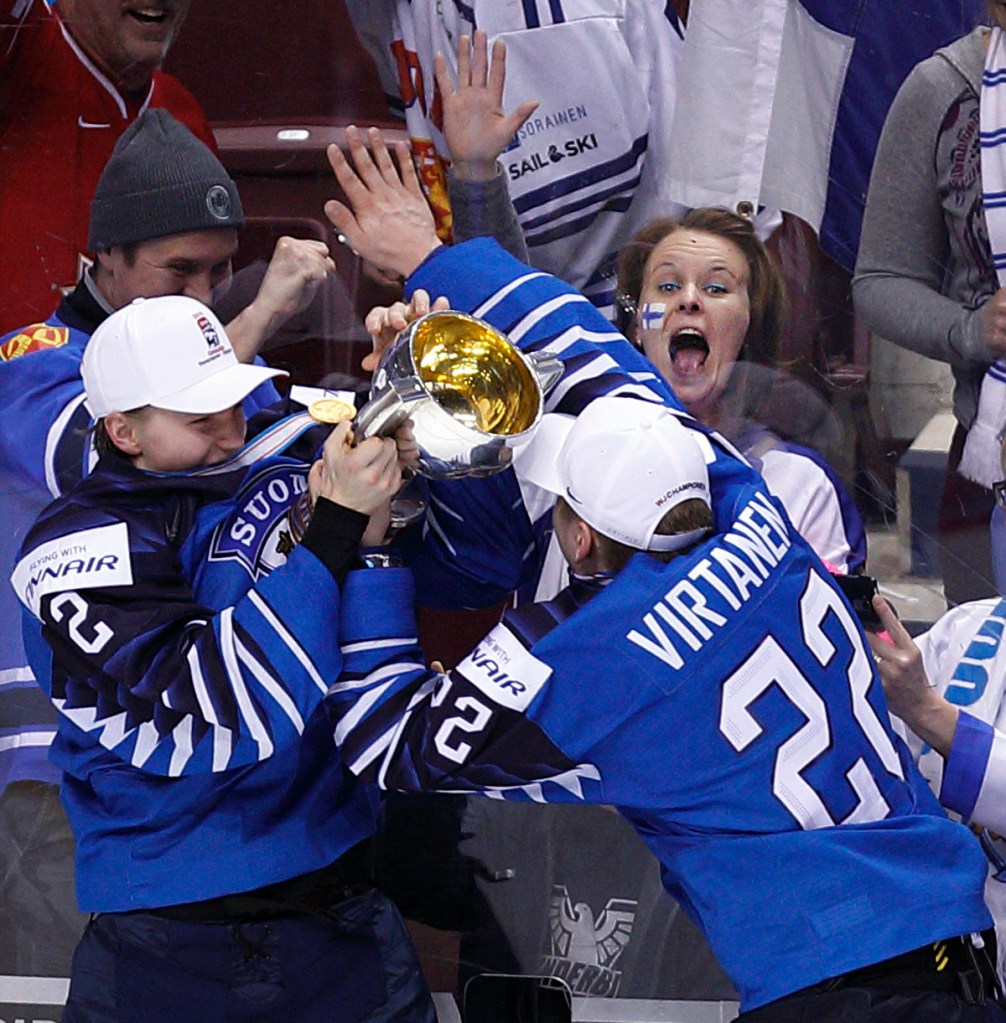 VANCOUVER , BC – JANUARY 5: Finland celebrates with the trophy after a victory against the United States following the gold medal game at the IIHF World Junior Championships at Rogers Arena on January 5, 2019 in Vancouver, British Columbia, Canada. © 2019 KEVIN LIGHT