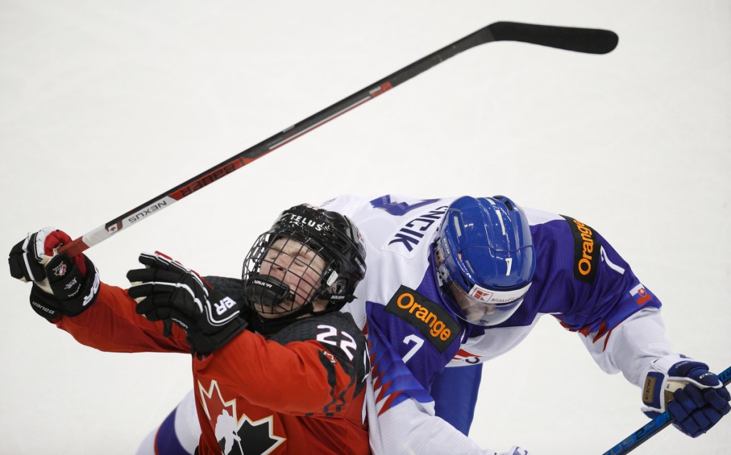 VICTORIA , BC – DECEMBER 21: Alexis Lafreniere #22 of Team Canada is checked by Marek Korencik #7 of Team Slovakia at the IIHF World Junior Championships at the Save-on-Foods Memorial Centre on December 21, 2018 in Victoria, British Columbia, Canada. © 2019 KEVIN LIGHT