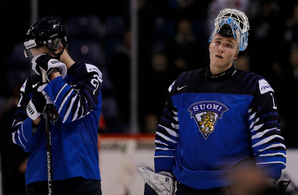 VICTORIA , BC – DECEMBER 26: Otto Latvala #21 and Ukko-Pekka Luukkonen #1 of Finland following a loss to Sweden at the IIHF World Junior Championships at the Save-on-Foods Memorial Centre on December 26, 2018 in Victoria, British Columbia, Canada. © 2019 KEVIN LIGHT