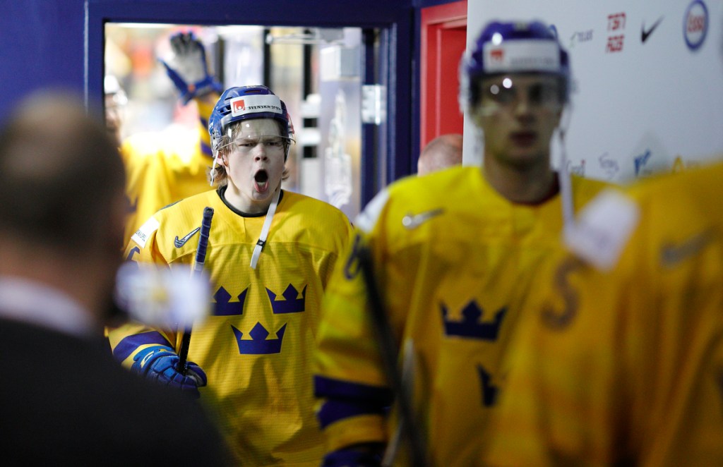 VICTORIA , BC – JANUARY 2: Rasmus Sandin #8 of Sweden spits onto the ice following a 2-0 quarter-final game loss to Switzerland at the IIHF World Junior Championships at the Save-on-Foods Memorial Centre on January 2, 2019 in Victoria, British Columbia, Canada.