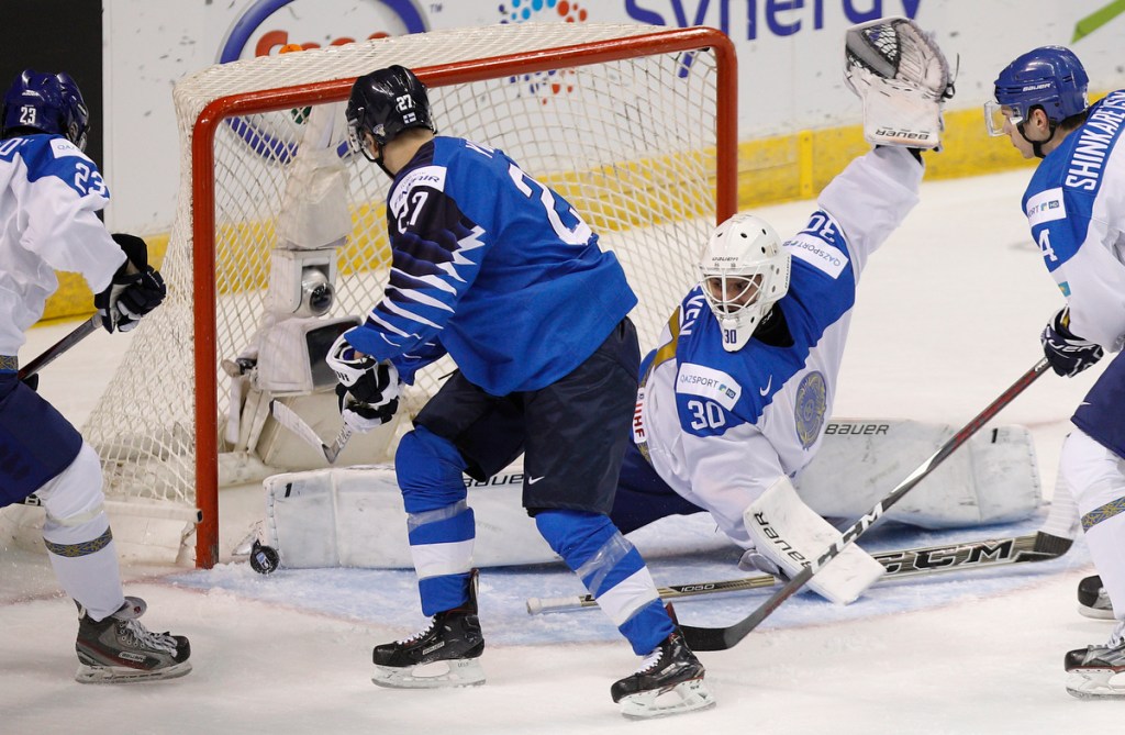 VICTORIA , BC – DECEMBER 27: Jesse Ylonen #27 of Finland is stopped by Demid Yeremeyev #30 of Kazakhstan at the IIHF World Junior Championships at the Save-on-Foods Memorial Centre on December 27, 2018 in Victoria, British Columbia, Canada. © 2019 KEVIN LIGHT