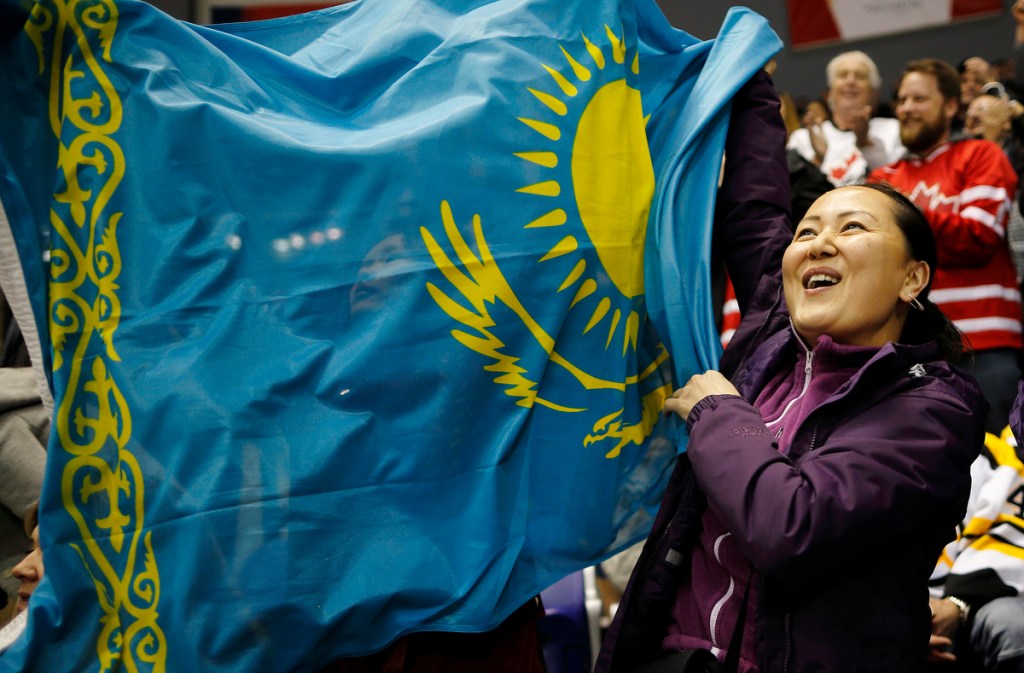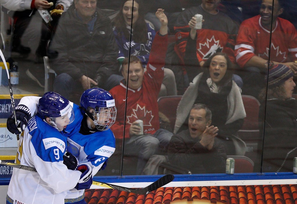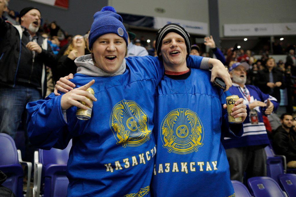 VICTORIA , BC – DECEMBER 31: Two Kazakhstan fans celebrate following a goal versus Sweden at the IIHF World Junior Championships at the Save-on-Foods Memorial Centre on December 31, 2018 in Victoria, British Columbia, Canada. © 2019 KEVIN LIGHT