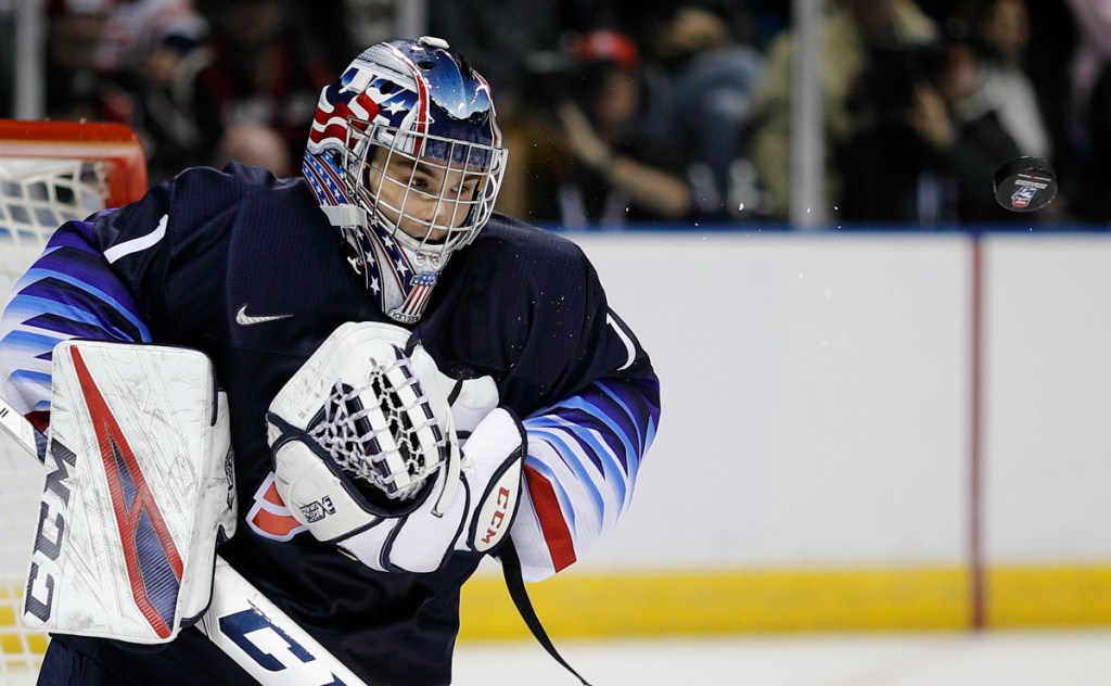 VICTORIA , BC – DECEMBER 29: Kyle Keyser #1 of the United States watches the puck versus Sweden at the IIHF World Junior Championships at the Save-on-Foods Memorial Centre on December 29, 2018 in Victoria, British Columbia, Canada. © 2019 KEVIN LIGHT