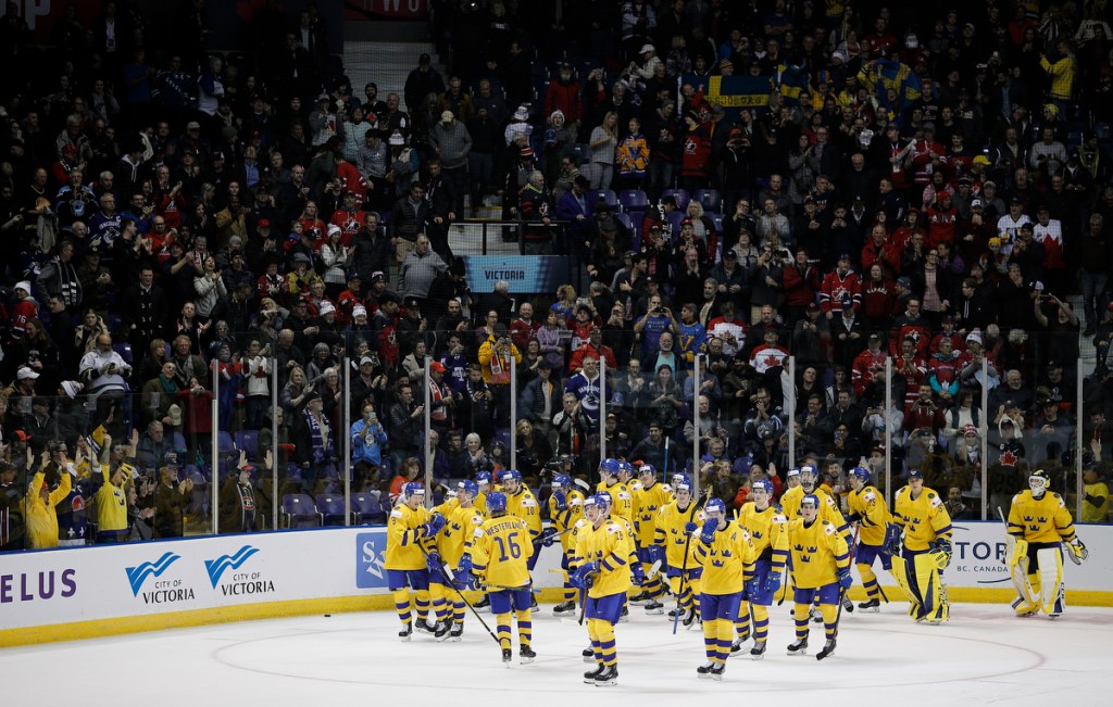 VICTORIA , BC – DECEMBER 29: Team Sweden celebrates following an overtime win versus the United States at the IIHF World Junior Championships at the Save-on-Foods Memorial Centre on December 29, 2018 in Victoria, British Columbia, Canada. © 2019 KEVIN LIGHT