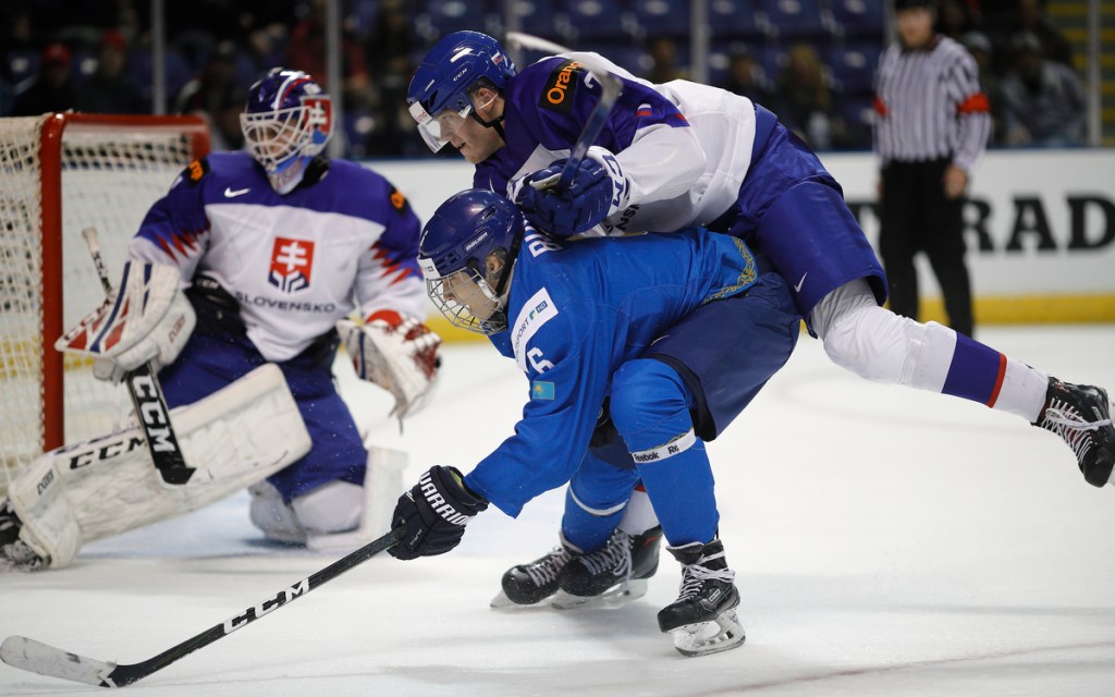 VICTORIA , BC – DECEMBER 30: Andrei Buyalski #6 of Kazakhstan attempts a shot on goal while being checked by Marek Korencik #7 of Slovakia at the IIHF World Junior Championships at the Save-on-Foods Memorial Centre on December 30, 2018 in Victoria, British Columbia, Canada. © 2019 KEVIN LIGHT
