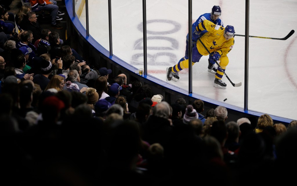 VICTORIA , BC – DECEMBER 29: Philip Broberg #25 of Sweden following a game versus the United States at the IIHF World Junior Championships at the Save-on-Foods Memorial Centre on December 29, 2018 in Victoria, British Columbia, Canada. © 2019 KEVIN LIGHT
