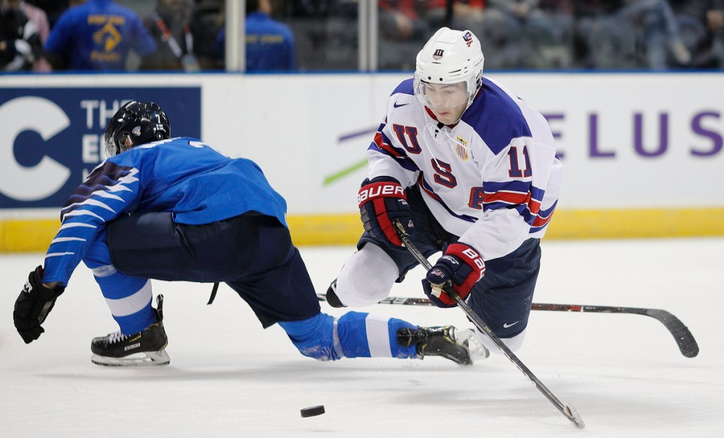 VICTORIA , BC – DECEMBER 31: Ryan Poehling #11 of the United States attempts a shot on goal after being tripped by Urho Vaakanainen #7 of Finland at the IIHF World Junior Championships at the Save-on-Foods Memorial Centre on December 31, 2018 in Victoria, British Columbia, Canada. © 2019 KEVIN LIGHT