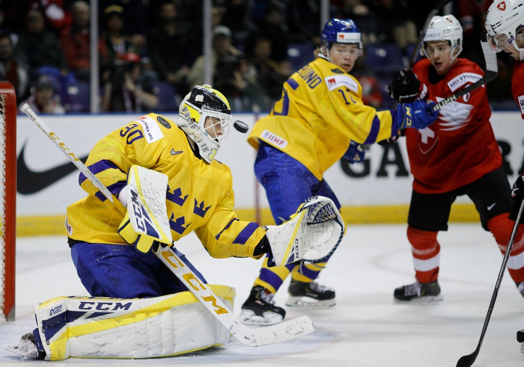 VICTORIA , BC – JANUARY 2: Goaltender Samuel Ersson #30 of Sweden attempts to make a glove save versus Switzerland during a quarter-final game at the IIHF World Junior Championships at the Save-on-Foods Memorial Centre on January 2, 2019 in Victoria, British Columbia, Canada. © 2019 KEVIN LIGHT