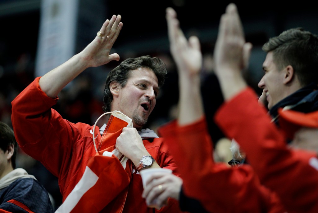 VICTORIA , BC – JANUARY 2: Swiss fans celebrate following a goal during the second period of a quarter-final game versus Sweden at the IIHF World Junior Championships at the Save-on-Foods Memorial Centre on January 2, 2019 in Victoria, British Columbia, Canada.
