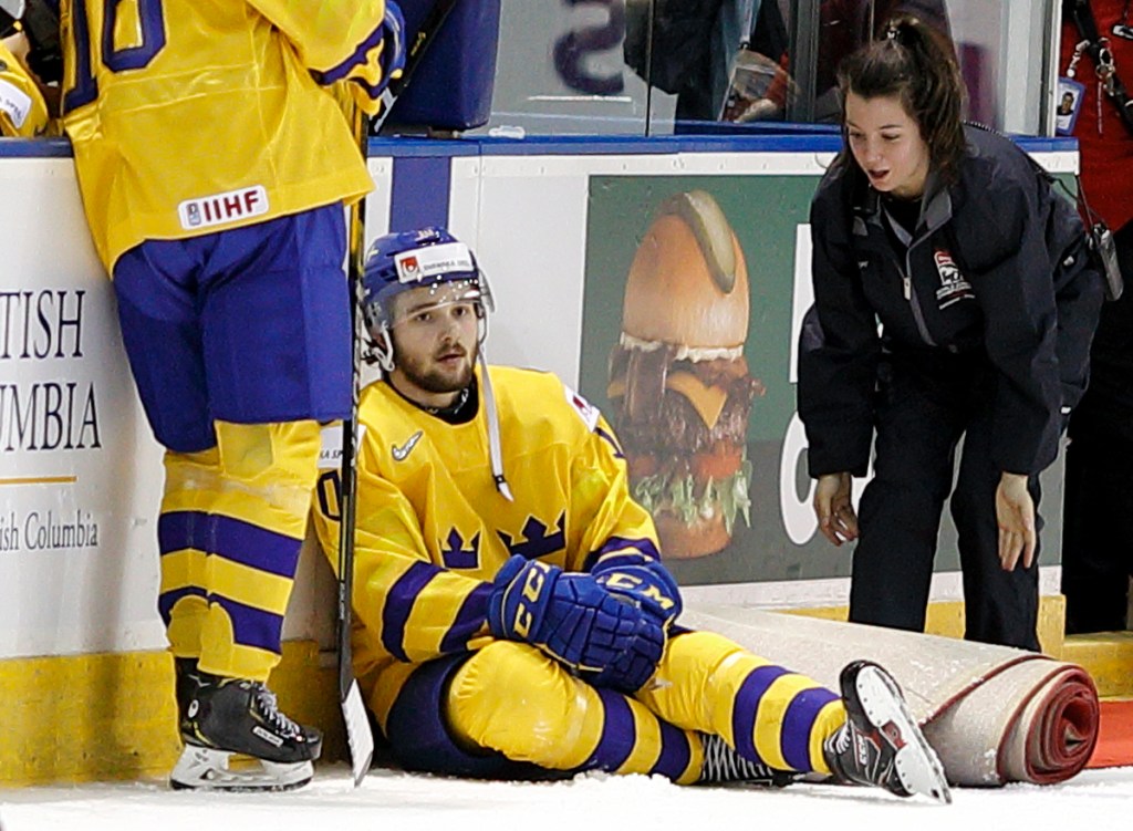 VICTORIA , BC – JANUARY 2: Emil Bemstrom #10 of Sweden sits on the ice following a 2-0 quarter-final game loss to Switzerland as an arena worker attempts to unroll the carpet for the player of the game presentations at the IIHF World Junior Championships at the Save-on-Foods Memorial Centre on January 2, 2019 in Victoria, British Columbia, Canada. © 2019 KEVIN LIGHT