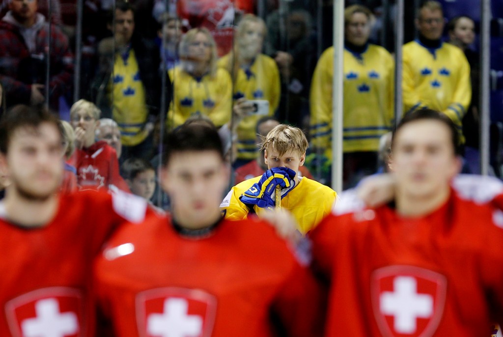 VICTORIA , BC – JANUARY 2: Filip Sveningsson #17 of Sweden listens to the Swiss National Anthem following a 2-0 quarter-final game loss to Switzerland at the IIHF World Junior Championships at the Save-on-Foods Memorial Centre on January 2, 2019 in Victoria, British Columbia, Canada. © 2019 KEVIN LIGHT