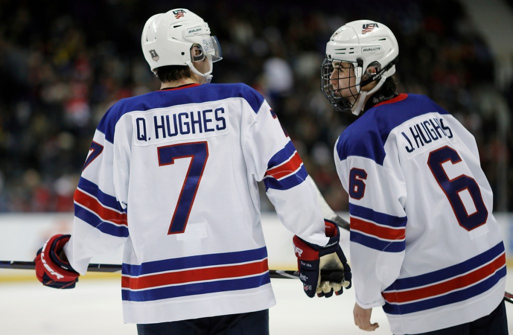 VICTORIA , BC – JANUARY 2: Quinn Hughes #7 and brother Jack Hughes #6 of the United States talk during a quarter-final game versus the Czech Republic at the IIHF World Junior Championships at the Save-on-Foods Memorial Centre on January 2, 2019 in Victoria, British Columbia, Canada. © 2019 KEVIN LIGHT