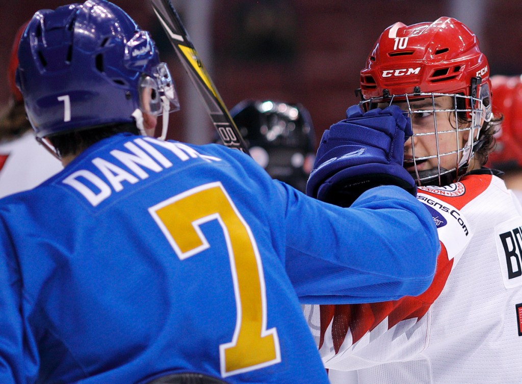 VICTORIA , BC – JANUARY 2: Josh Norris #14 of the United States smiles while being pushed by Martin Kaut #16 of the Czech Republic during a quarter-final game at the IIHF World Junior Championships at the Save-on-Foods Memorial Centre on January 2, 2019 in Victoria, British Columbia, Canada. © 2019 KEVIN LIGHT