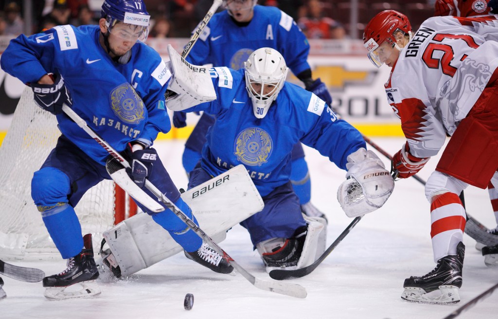 VANCOUVER , BC – JANUARY 4: Goaltender Demid Yeremeyev #30 of Kazakhstan makes a save on Gustav Green #21 of Denmark as teammate Sayan Daniyar #17 clears the puck during a relegation round game at the IIHF World Junior Championships at Rogers Arena on January 4, 2019 in Vancouver, British Columbia, Canada. © 2019 KEVIN LIGHT