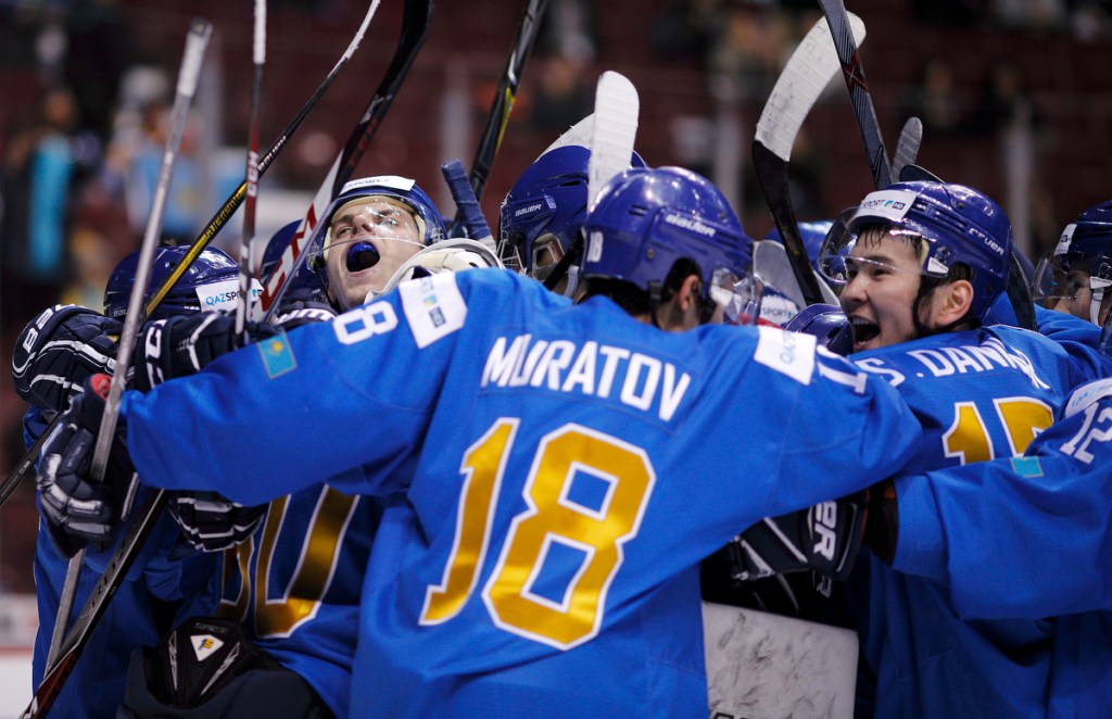 VANCOUVER , BC – JANUARY 4: Team Kazakhstan celebrates after defeating Denmark in a relegation round game at the IIHF World Junior Championships at Rogers Arena on January 4, 2019 in Vancouver, British Columbia, Canada. © 2019 KEVIN LIGHT