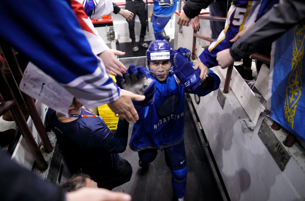 VICTORIA , BC – DECEMBER 27: Demid Yeremeyev #30 of Kazakhstan high fives with fans as he leaves the ice being congratulated by an official following a game versus Finland at the IIHF World Junior Championships at the Save-on-Foods Memorial Centre on December 27, 2018 in Victoria, British Columbia, Canada. © 2019 KEVIN LIGHT