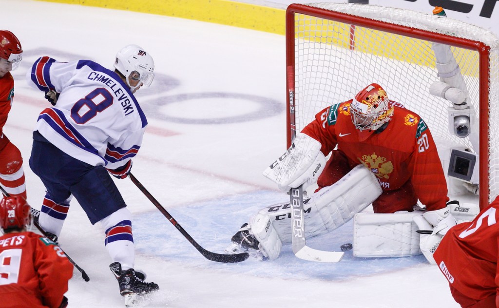 VANCOUVER , BC – JANUARY 4: Alexander Chmelevski #8 of the United States scores a goal in the first period on goaltender Pyotr Kochetkov #20 of Russia during a semi-final game at the IIHF World Junior Championships at Rogers Arena on January 4, 2019 in Vancouver, British Columbia, Canada. © 2019 KEVIN LIGHT