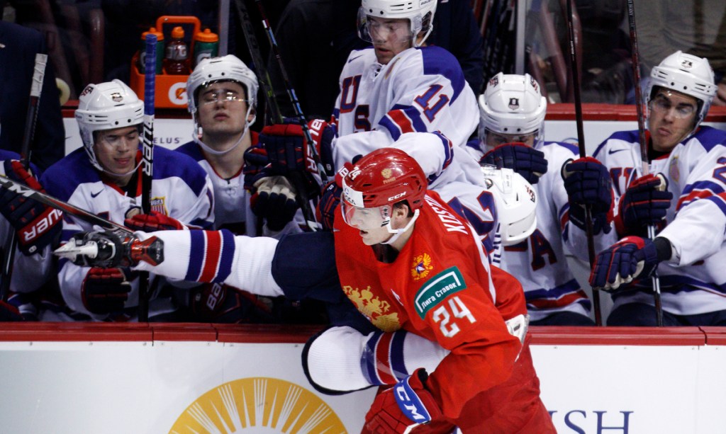 VANCOUVER , BC – JANUARY 4: Mikey Anderson #26 of the United States is bodychecked into the bench by Klim Kostin #24 of Russia during a semi-final game at the IIHF World Junior Championships at Rogers Arena on January 4, 2019 in Vancouver, British Columbia, Canada. © 2019 KEVIN LIGHT