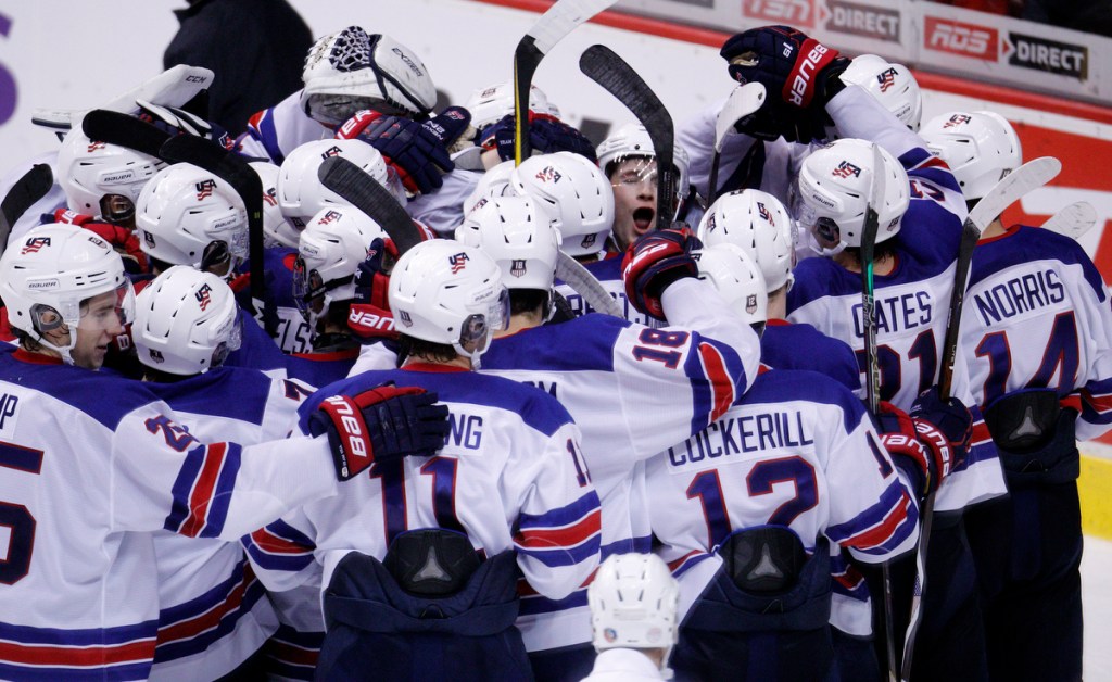 VANCOUVER , BC – JANUARY 4: Team USA celebrates following a victory against Russia in a semi-final game at the IIHF World Junior Championships at Rogers Arena on January 4, 2019 in Vancouver, British Columbia, Canada. © 2019 KEVIN LIGHT