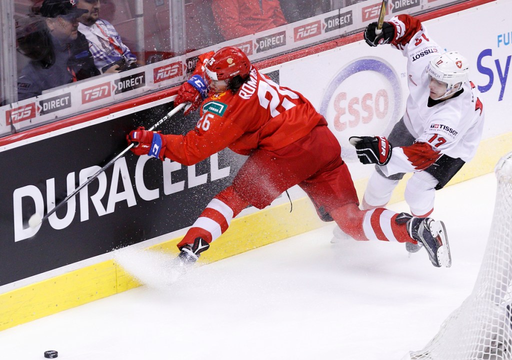 VANCOUVER , BC – JANUARY 5: Alexander Romanov #26 of Russia crashes into the boards while being chased by Luca Wyss #17 of Switzerland during a bronze medal game at the IIHF World Junior Championships at Rogers Arena on January 5, 2019 in Vancouver, British Columbia, Canada. © 2019 KEVIN LIGHT