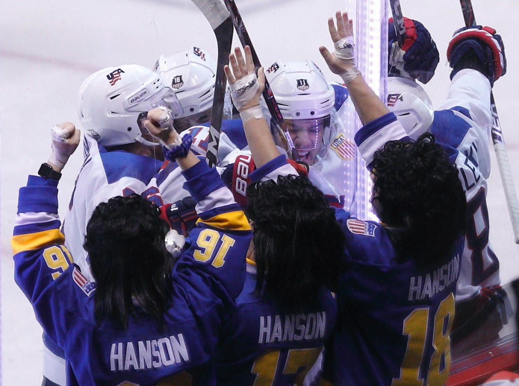 VANCOUVER , BC – JANUARY 4: Ryan Poehling #11 of the United States celebrates a goal with his teammates during a semi-final game against Russia as fans dressed as the Hanson Brothers bang on the glass at the IIHF World Junior Championships at Rogers Arena on January 4, 2019 in Vancouver, British Columbia, Canada. © 2019 KEVIN LIGHT