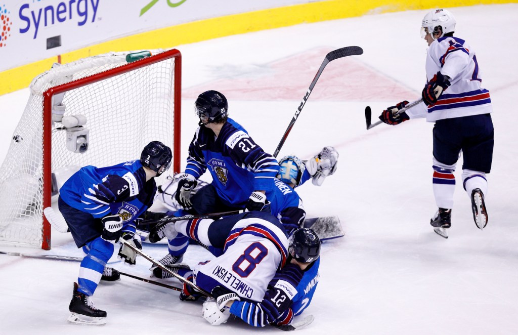 VANCOUVER , BC – JANUARY 5: Oliver Wahlstrom #18 of the United States has a goal disallowed in the first period against Finland of a gold medal game at the IIHF World Junior Championships at Rogers Arena on January 5, 2019 in Vancouver, British Columbia, Canada. © 2019 KEVIN LIGHT