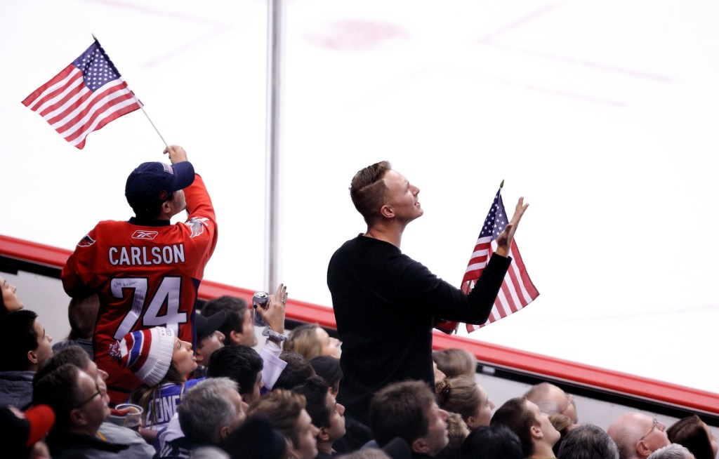 VICTORIA , BC – JANUARY 2: Team Captain Mikey Anderson #26, Jack Hughes #6 (middle) and Joel Farabee #28 of the United States stand on the blue line as the American flag is raised following a 3-1 quarter-final game victory versus the Czech Republic at the IIHF World Junior Championships at the Save-on-Foods Memorial Centre on January 2, 2019 in Victoria, British Columbia, Canada. © 2019 KEVIN LIGHT