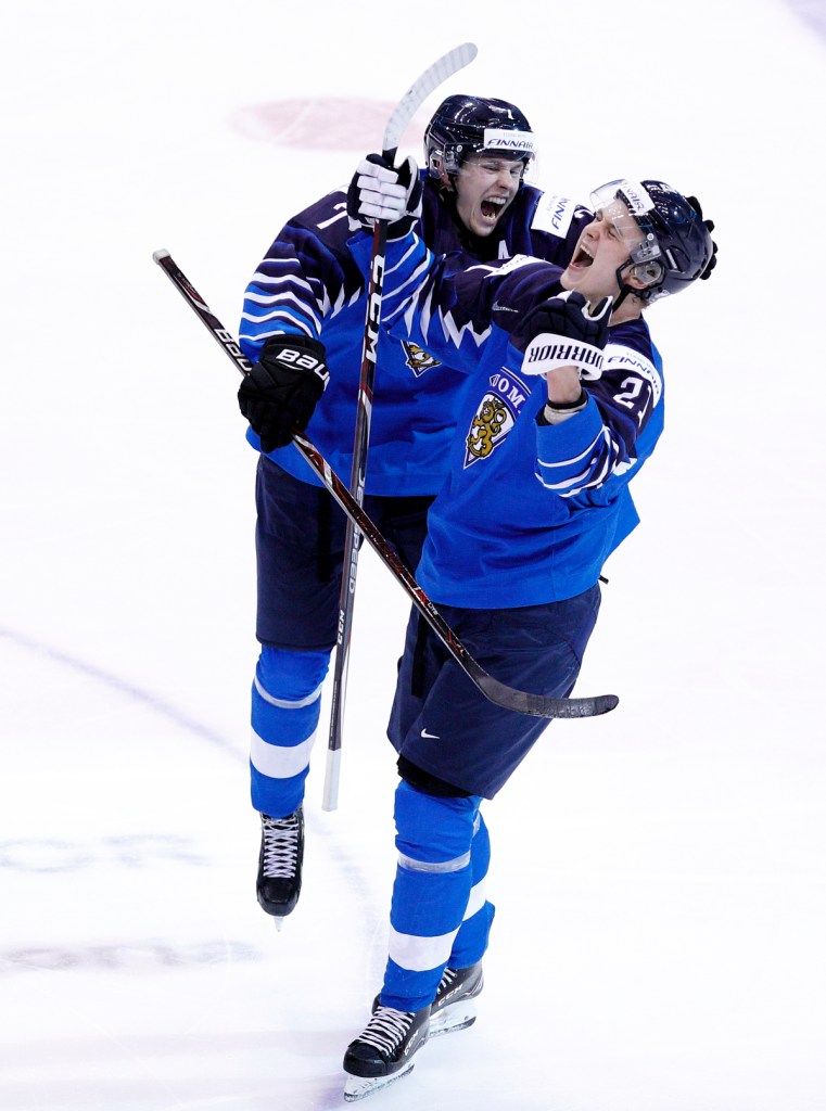 VANCOUVER , BC – JANUARY 5: Otto Latvala #21 of Finland celebrates a third period goal with teammate Urho Vaakanainen #7 during the gold medal game against the United States at the IIHF World Junior Championships at Rogers Arena on January 5, 2019 in Vancouver, British Columbia, Canada. © 2019 KEVIN LIGHT
