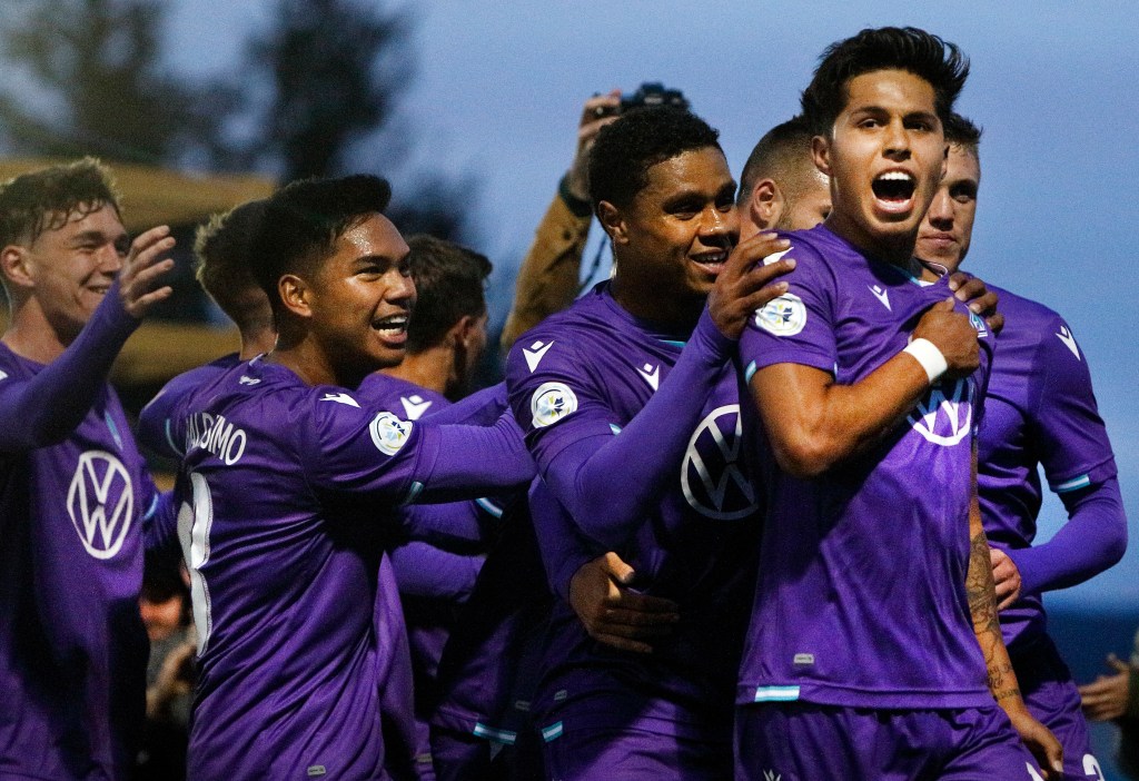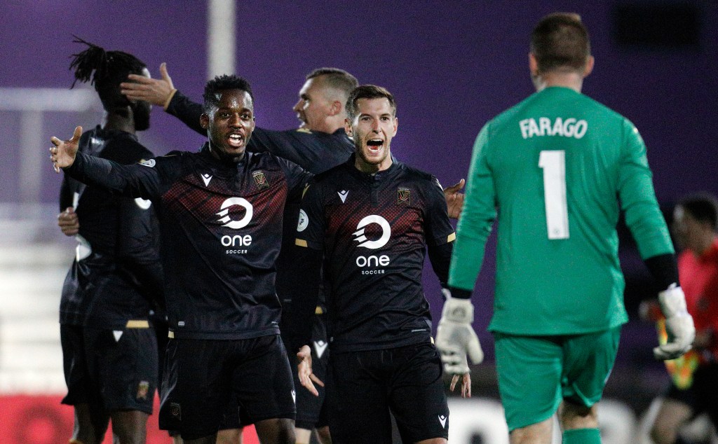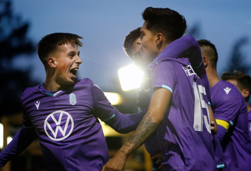 Ohin #27 of the Winnipeg Valour FC celebrates with teammates Louis Bland-Goyette #5 and Tyson Farago #1 following their 2-1 victory against Pacific FC at Westhills Stadium in Langford, British Columbia on May 1, 2019. (KEVIN LIGHT).